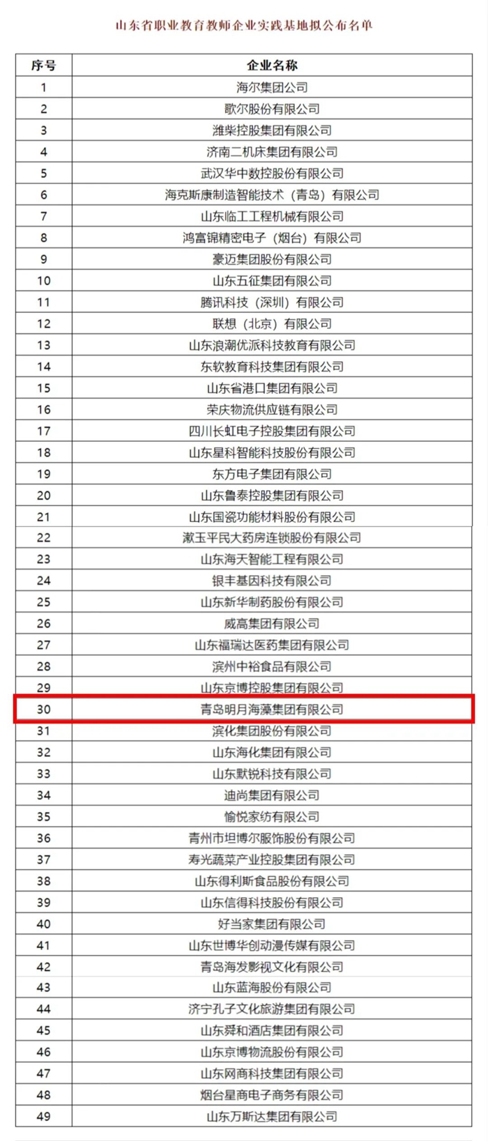 1月3日,山東省教育廳網站發布公示消息,經各市、各高職院校推薦、專家評審,擬確定青島明月海藻集團有限公司等49家企業為山東省職業教育教師企業實踐基地。公示期為2023年1月3日至1月10日。