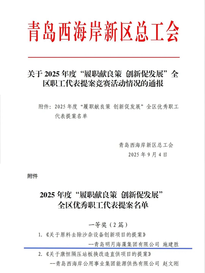 近日,在青島西海岸新區總工會主辦的“履職獻良策 創新促發展”職工代表提案競賽中,明月海藻集團提報的《關于原料去除沙雜設備創新項目的提案》從23件優秀提案中脫穎而出,榮獲大賽最高獎項一等獎!