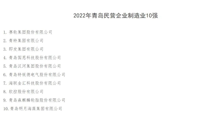 2022年9月19日,青島市工商業聯合會公布“2022年青島民營企業100強、制造業企業10強、服務業企業10強、農業企業10強、創新企業10強、創新潛力企業10強、吸納就業10強”入圍名單。經企業申報、部門推薦、專家評審等程序,青島明月海藻集團連續三年榮登2022年青島民營企業100強榜、制造業企業10強榜。