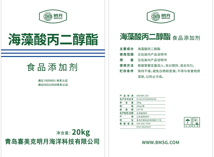海藻酸丙二醇酯,又名藻酸丙二醇酯( PGA ),由天然海藻中提取的海藻酸深加工制成,外觀為白色或淡黃色粉末,水溶液呈粘稠狀膠體。和海藻酸鹽相比,具有更強的耐酸耐鹽能力,是一種性能優良的海洋食品添加劑。